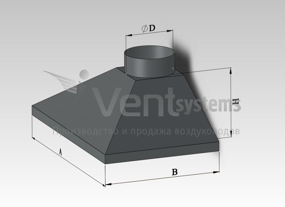 Вытяжной зонт изготавливается из металла. Конструктивно он представляет собой открытый снизу короб, подсоединенный к вытяжному воздуховоду. Такие зонты могут работать и при естественной, и при принудительной вентиляции.